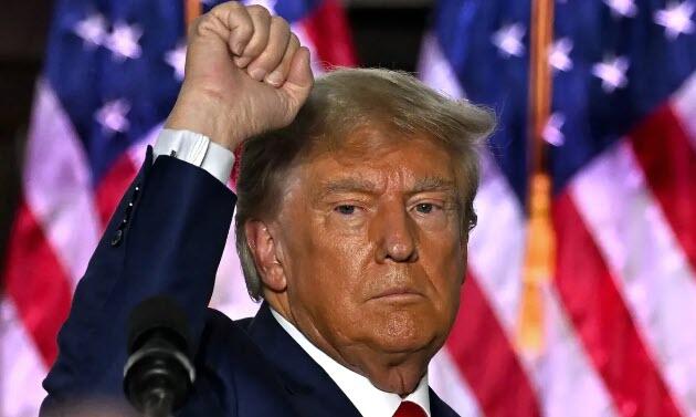 Former President Donald Trump gestures after delivering remarks at Trump National Golf Club Bedminster in Bedminster, N.J., on June 13, 2023. (Ed Jones/AFP via Getty Images)