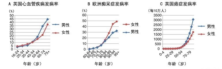 再看看英国和欧盟的数据,大家可以更直观地发现,和50岁前的“岁月静好”相比,50岁后就像按下了“加速”按钮,心血管疾病、痴呆症、癌症这三类常见慢性病都开始陡然增长,其中男性受心血管疾病和癌症威胁更大,而痴呆症则是女性更多见。