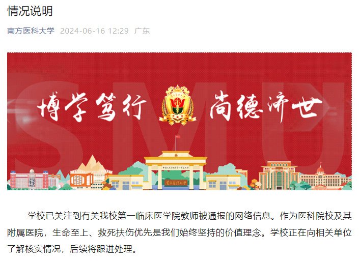 学校已关注到有关我校第一临床医学院教师被通报的网络信息。作为医科院校及其附属医院,生命至上、救死扶伤优先是我们始终坚持的价值理念。学校正在向相关单位了解核实情况,后续将跟进处理。
