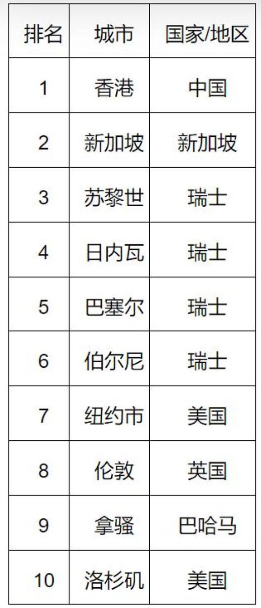 香港和新加坡今年再次成为了全球生活成本第一和第二昂贵的国际雇员派遣城市。瑞士的苏黎世、日内瓦和巴塞尔也同时位列全球前五个最昂贵城市。中国其他城市中排名最高的分别是上海和北京,分列第23位和第25位,较去年有所滑落。