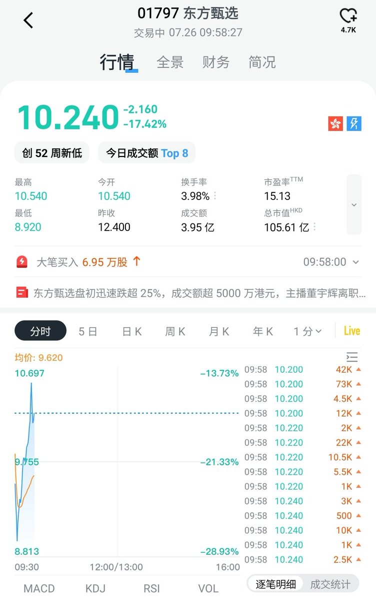 东方甄选宣布主播董宇辉离职后,港股股价一度跌超过2成,目前跌幅收窄。📉 https://t.co/fpSGUttZen