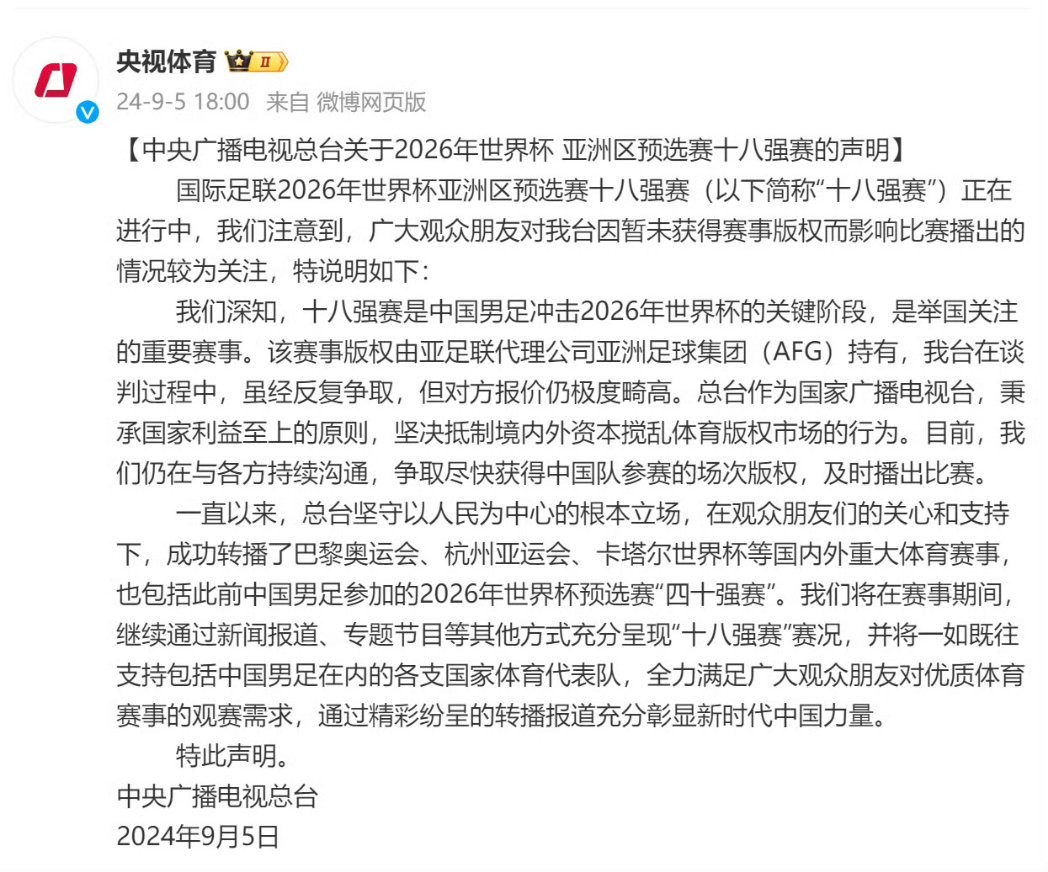 央视发声明回应不播国足比赛 https://t.co/XnWSe2vYm3