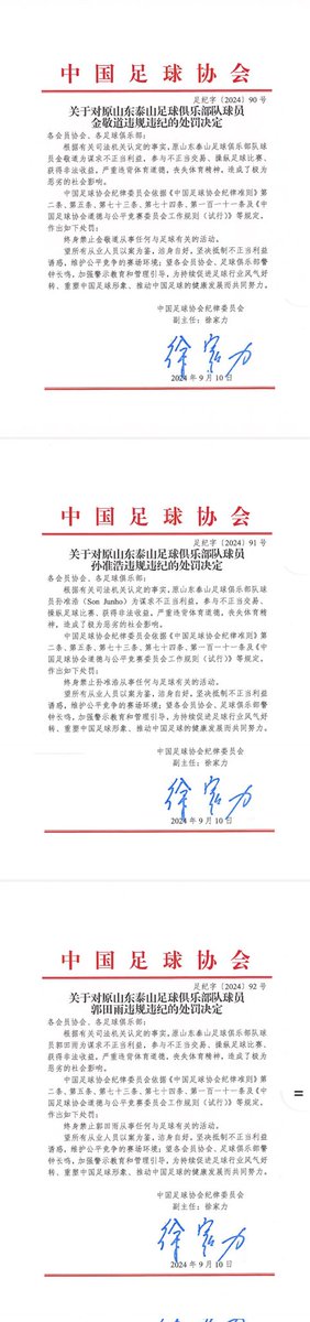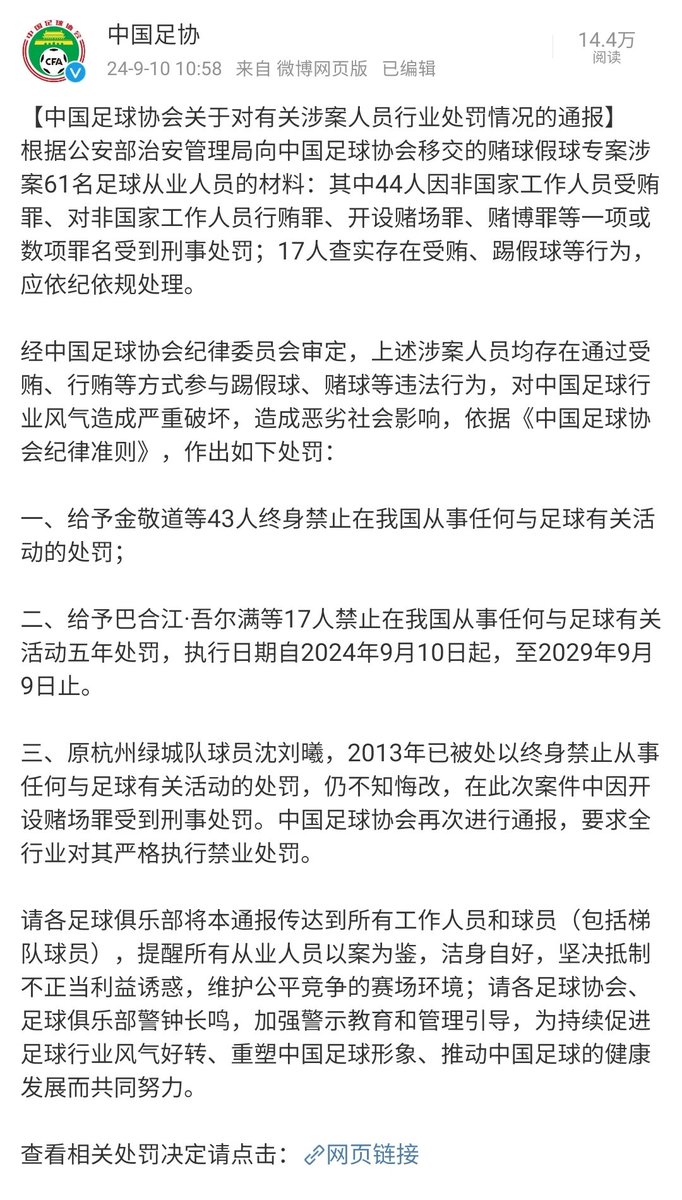 中国足球协会关于对有关涉案人员行业处罚情况的通报 https://t.co/1Sftk8Djxf