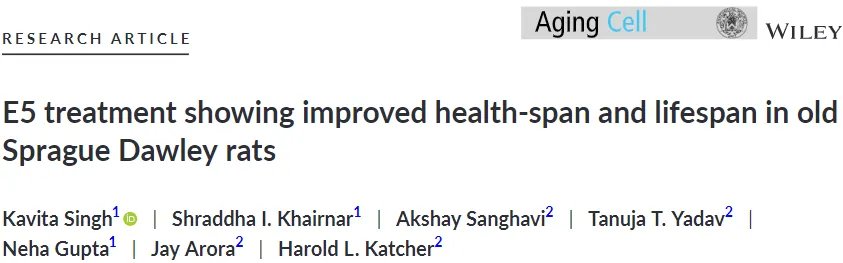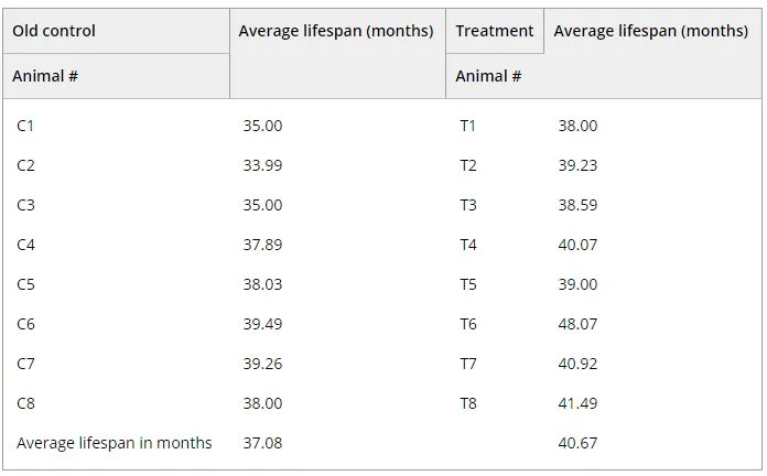 研究人员探究了E5处理对老年大鼠寿命的影响。结果发现,两组(即老年对照组和E5处理组)大鼠在33个月龄前均未发生死亡。对照组大鼠首次死亡时间为33.99个月,最大年龄为39.49个月,平均寿命为37.08个月。在E5治疗组中,首次死亡时间为38个月,平均寿命为40.67个月。令人惊奇的是,E5处理组的一只大鼠(名为“Sima”)存活了48个月,创造了世界纪录。