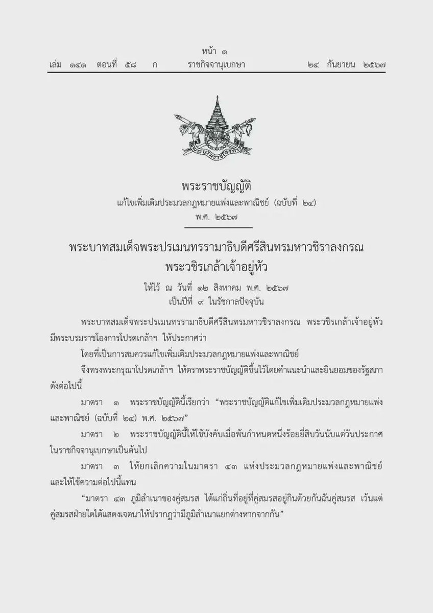 9月24日有消息传来,泰国十世王玛哈·哇集拉隆功国王在终于批准了6月份议会通过的《婚姻平等法案》,很快将在政府公报网站上公布,而此法令签署后将在120天内生效。 https://t.co/A6rkSJG8TQ