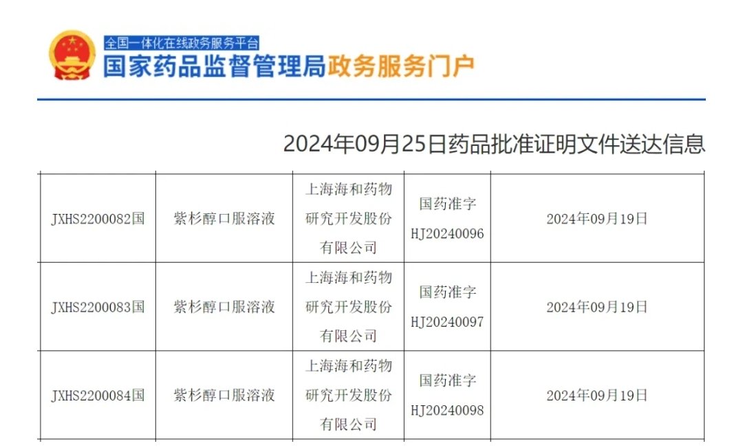 9月25日,由韩国大化制药和海和药物联合申报的5.1类新药紫杉醇口服溶液上市申请,已在中国获得批准。