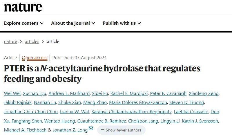 研究发现,哺乳动物中首个N-乙酰牛磺酸水解酶PTER(磷酸三酯酶相关蛋白),并在小鼠模型中证实了N-乙酰牛磺酸在食物摄入量减少、抗肥胖、改善葡萄糖稳态的重要作用,并揭示了PTER和N-乙酰牛磺酸在体重控制和能量平衡中的作用。