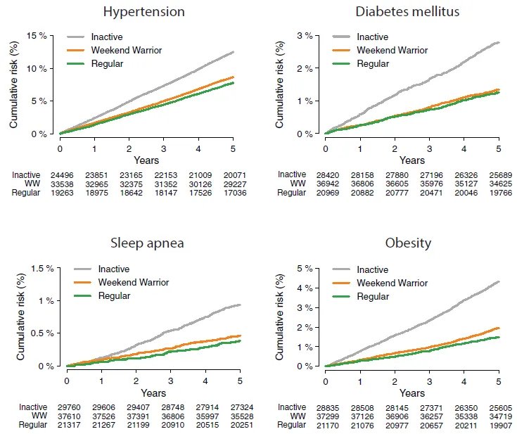 这表明,只要达到指南推荐的运动量,无论是均匀分散在周内,还是集中在周末,在降低疾病风险方面的益处相似。