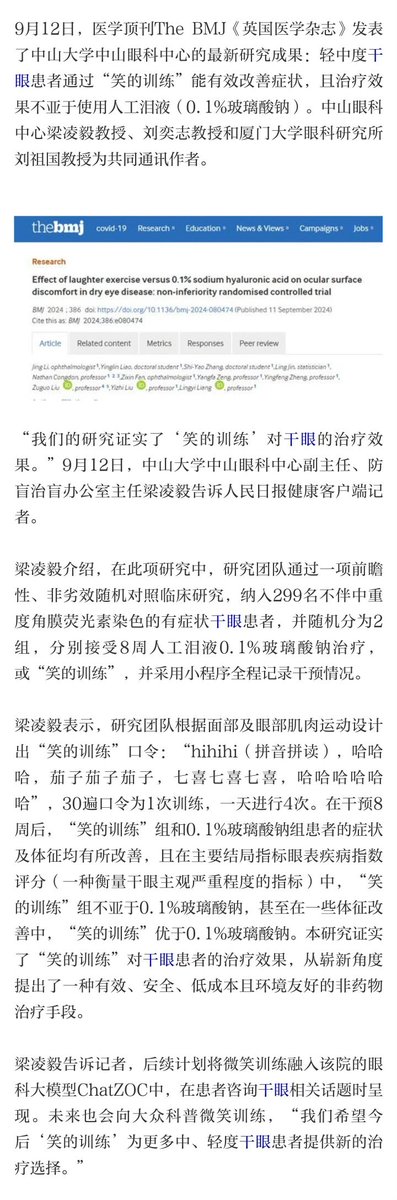 近日,中山大学中山眼科中心在医学顶刊The BMJ《英国医学杂志》发表了最新研究成果:轻中度干眼患者通过“笑的训练”能有效改善症状,且治疗效果不亚于使用人工泪液(0.1%玻璃酸钠)。