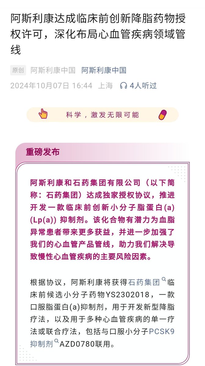 10月7日,阿斯利康中国宣布和石药集团达成独家授权协议,推进开发一款临床前创新小分子脂蛋白(a) (Lp(a)) 抑制剂。阿斯利康将获得石药集团临床前候选小分子药物YS2302018,一款口服脂蛋白(a)抑制剂,用于开发新型降脂疗法,以及用于多种心血管疾病的单一疗法或联合疗法,包括与口服小分子PCSK9抑制剂AZD0780联用。