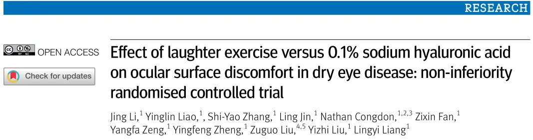 研究人员通过对比采用人工泪液(0.1% 玻璃酸钠)与「笑的训练」对干眼症进行治疗,研究结果显示「笑的训练」与人工泪液疗效相当,且在部分眼部体征改善上甚至还优于人工泪液(0.1% 玻璃酸钠),这也为长期依赖眼药水的干眼症患者提出了一种有效、安全、低成本且环境友好的非药物治疗手段。