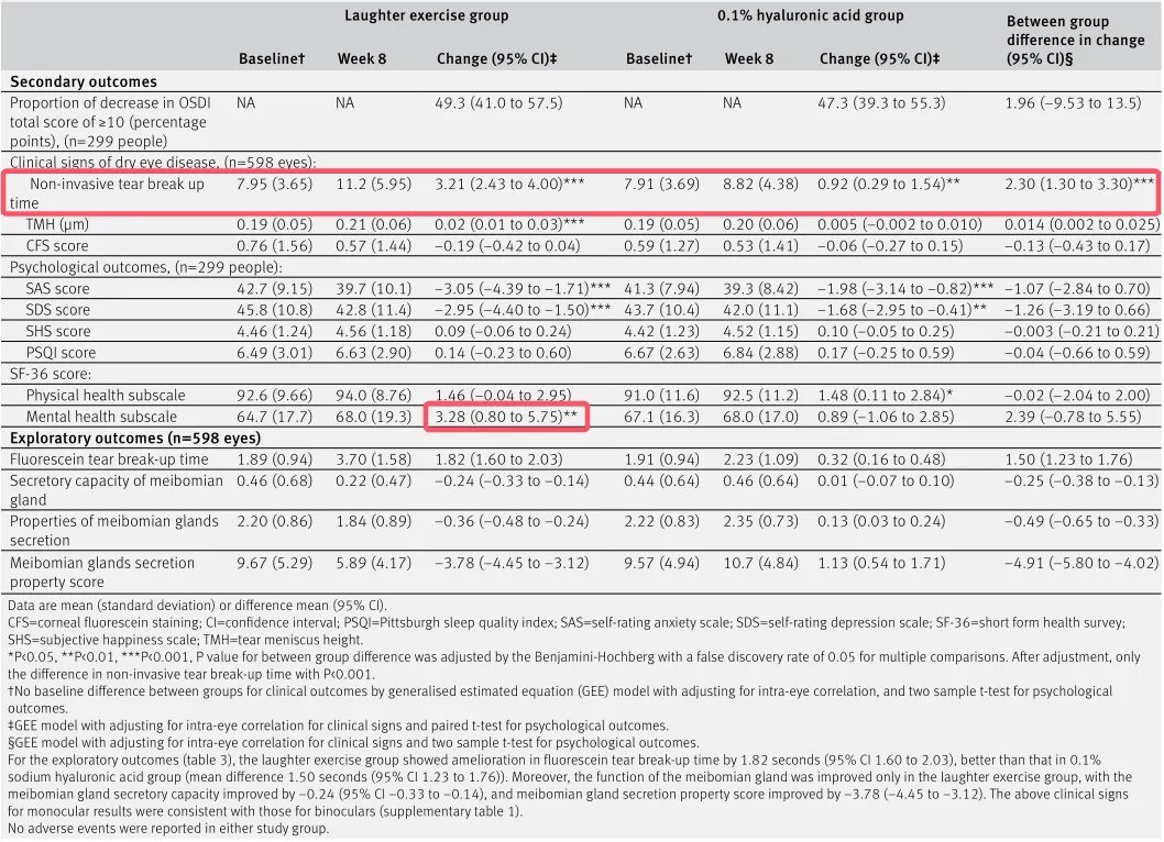 研究结果表明,「笑的训练」在缓解干眼症症状方面不劣于 0.1% 玻璃酸钠滴眼液。此外,研究团队发现坚持「笑的训练」可以提高泪膜的稳定性和睑板腺的功能。总的来说,该研究展现了「笑的训练」在治疗干眼症症状方面的巨大潜力!