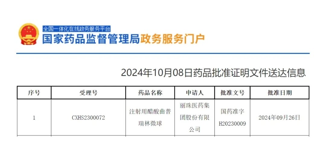 10月8日,丽珠医药注射用醋酸曲普瑞林微球的新适应症上市申请,已获得中国国家药监局获得批准。