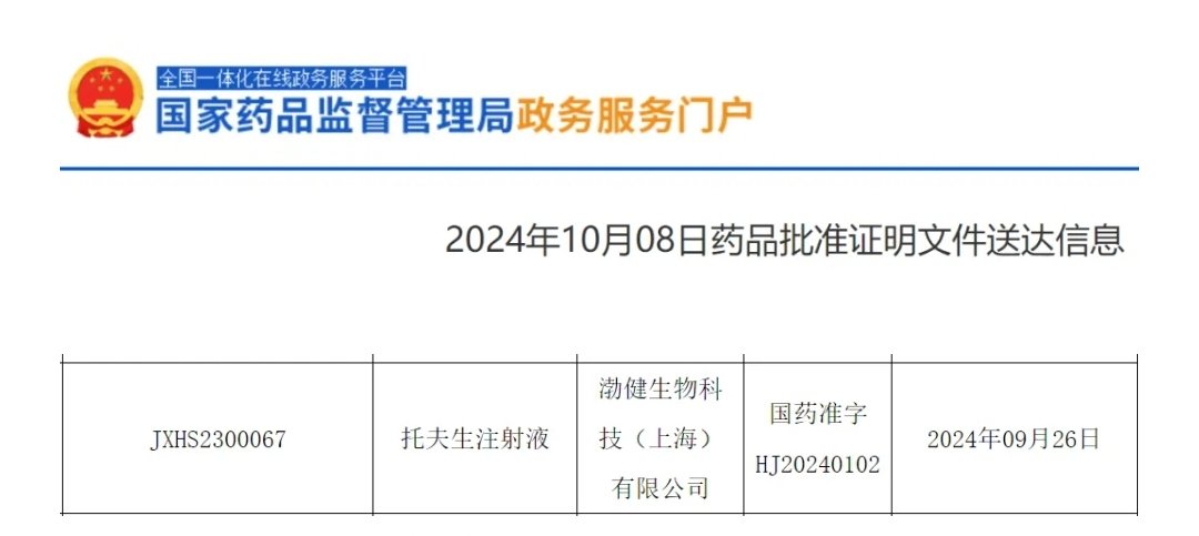 10月8日,渤健公司5.1类新药托夫生注射液的上市申请,已获得中国国家药监局批准