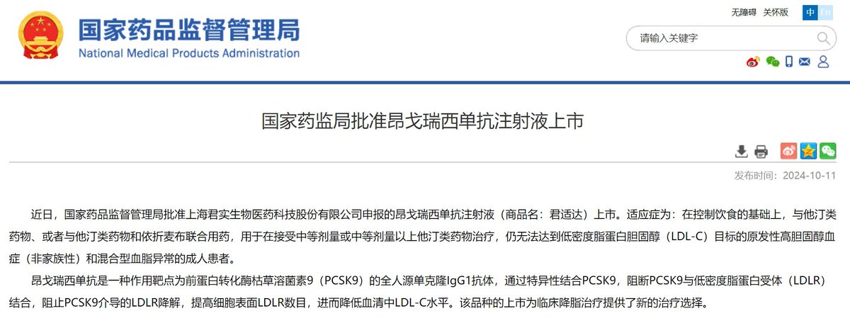 适应症:在控制饮食的基础上,与他汀类药物、或者与他汀类药物和依折麦布联合用药,用于在接受中等剂量或中等剂量以上他汀类药物治疗,仍无法达到低密度脂蛋白胆固醇目标的原发性高胆固醇血症(非家族性)和混合型血脂异常的成人患者 https://t.co/h4nvg6ADWk