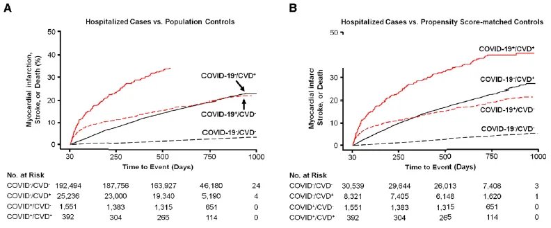 在这项研究中,研究人员分析了英国生物样本库中2020年2-12月期间10005名感染新冠的人和217730名未感染的人,分析了新冠感染与发生重大不良心脏事件(MACE)之间的关系,包括心脏病发作、中风和全因死亡。