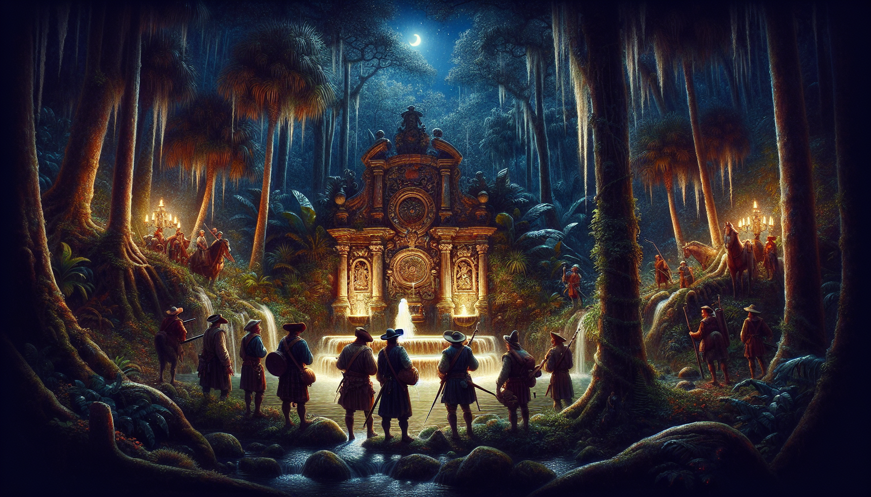 You find yourself standing on the shores of the New World, your ship anchored nearby. As you explore the beach, you stumble upon a faded map half-buried in the sand. The map seems to be a clue leading to the mystical Fountain of Youth. Your task is to decipher the clues and find the location of the fountain. Choose your next move: