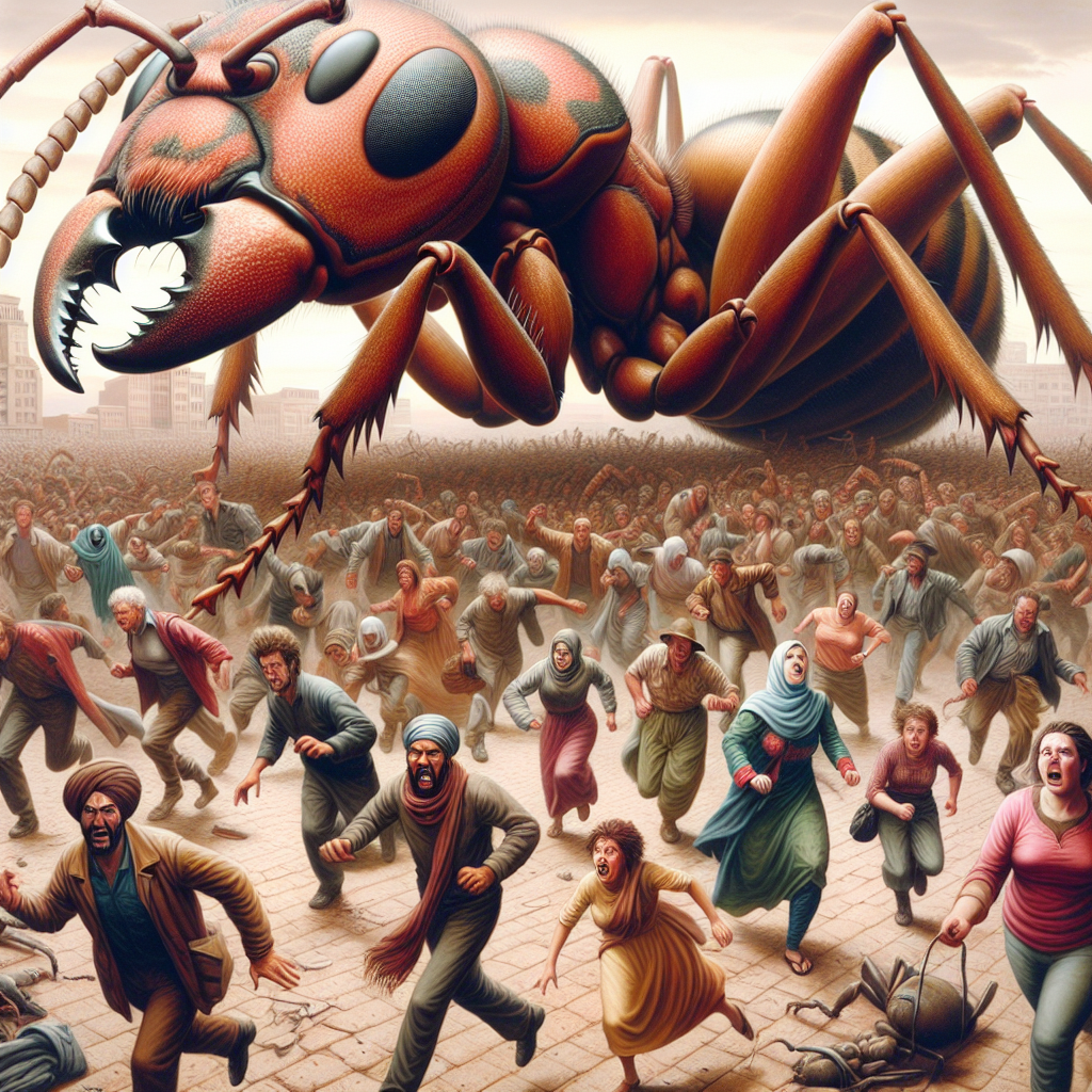 You wake up in your small apartment, groggy from a restless night's sleep. As you stumble out of bed, you notice the TV is on, broadcasting a breaking news report. The screen shows chaotic scenes of people running and screaming, while a news anchor frantically reports, "Giant ants have emerged from underground and are attacking the city! Stay indoors and seek shelter immediately!"