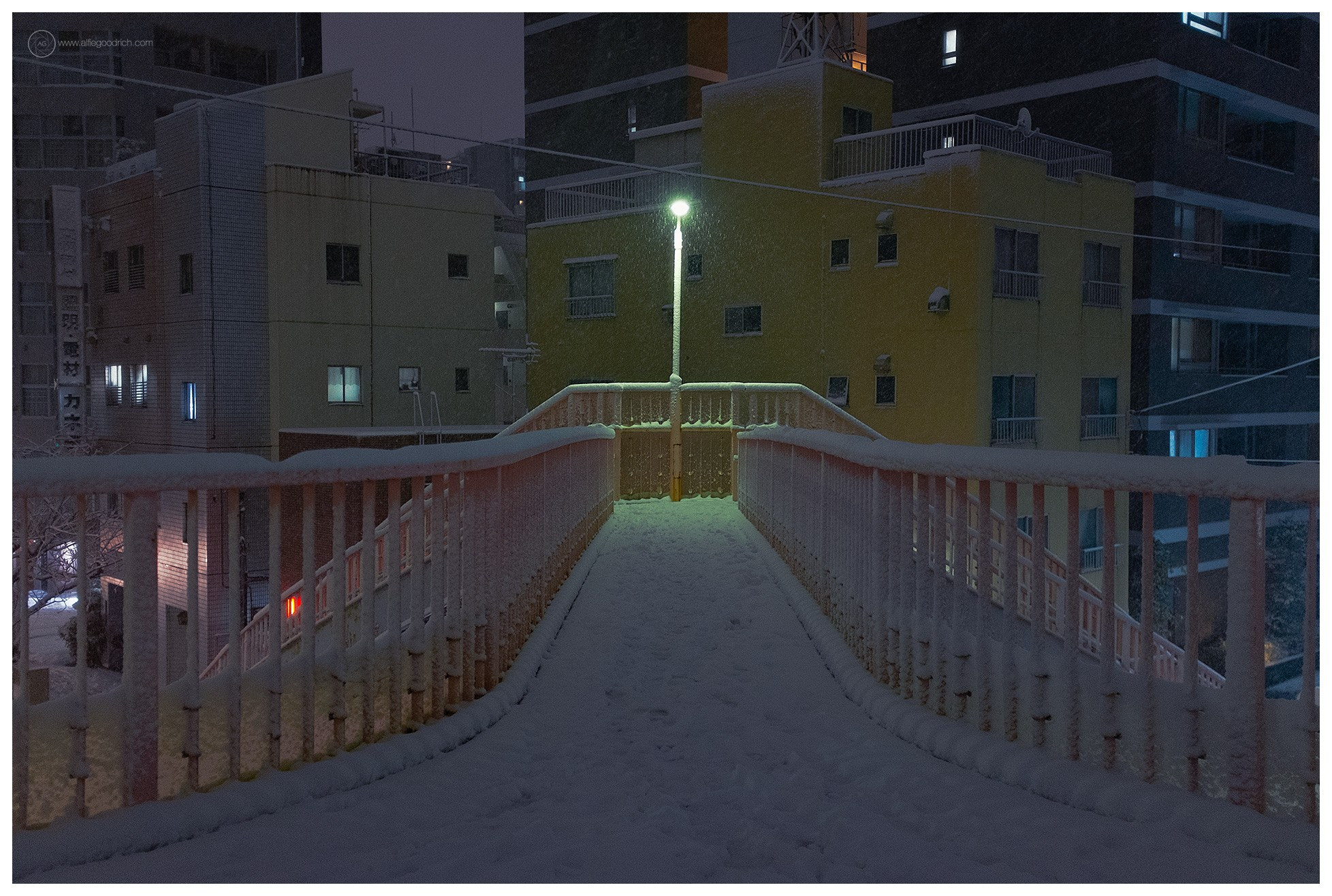 Snowy pedestrian bridge in Ōmori, Tokyo.